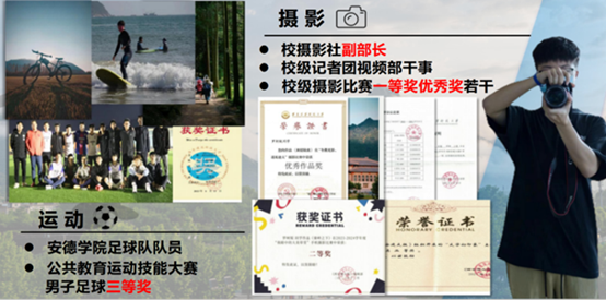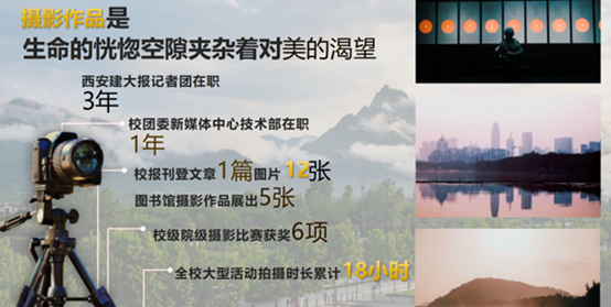 校报记者团、校团委新媒体中心,印证着他的每步足迹;校报刊登照片12张,记录着他眼中的建大;“大美草堂”等一系列摄影比赛,一等奖优秀奖6项,校庆运动会等大型活动拍摄时长18小时,见证着他的进步与成长。学习示范乡村,积极拍摄小城,他用相机为家乡建设添砖加瓦;参观抑郁症主题展览,记录非遗传承人,他用相机为特定群体努力发声;参加艺术展览,拍摄珍贵动物,他用相机为人生赋予丰富含义。