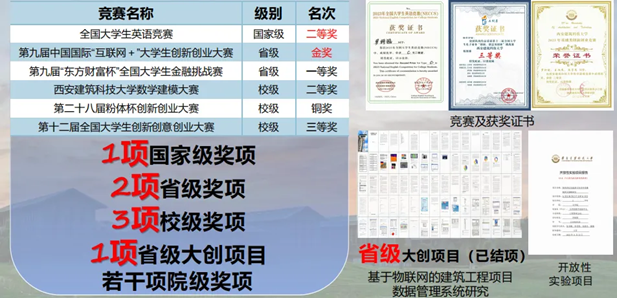 在国家推进“一带一路”建设背景下,学院致力于培养服务于未来智慧城市建设与管理的高层次国际化人才。因此在学习之余,罗柯锐积极参加各项比赛,在“互联网+”比赛中,获得省级金奖;在大英赛中,获得国家二等奖;在东方财富杯中,获得省级一等奖;此外,他还参与了1项省级大创项目,主研基于物联网的建筑工程项目数据管理系统。从个人能力到专业领域,在学院多元格局的培养下,罗柯锐同学致力于做一个“全能青年”。