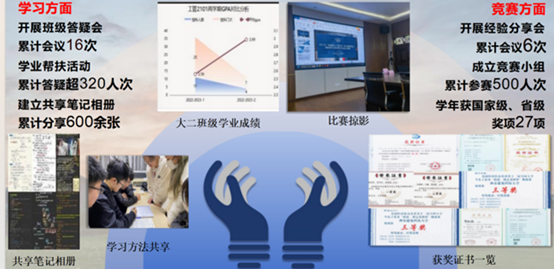 一人行速,众人行远。作为班级先锋的他带领大家一起学习,累计答疑超320人次;建立共享笔记,累计分享600余张;多次组织考前复习,帮助多名基础较弱的同学顺利通过考试。在全班同学共同努力下,工管2101班成为全年级挂科人次最少的班级。在竞赛上,罗柯锐带头成立竞赛小组,激发班级成员参赛热情,参与双创竞赛达500人次,共获得各类奖项27项。班级最终绩点、综测均位列年级第一,获得“争先创优”先进班集体殊荣。