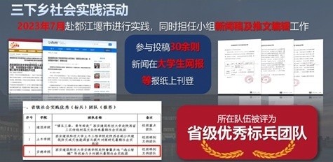 纸上得来终觉浅,绝知此事要躬行。在2023年的暑假,他参加了“三下乡“社会实践活动,担任小组新闻稿编辑工作,向国家级新闻平台投稿30余篇。所在队伍最终被评为省级优秀标兵团队。