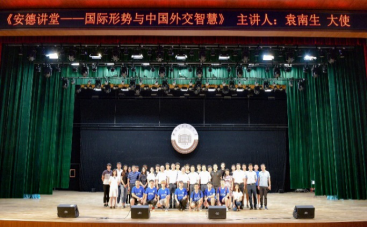 当日晚7时,袁南生大使在我校草堂校区紫阁大礼堂作了主题为《国际形势与中国外交智慧》的报告。