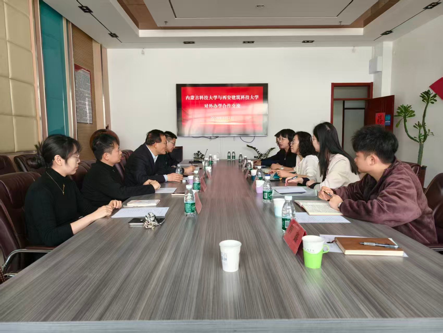 会后,熊仲明一行与内蒙古科技大学国际教育学院院长孙岩柏进行座谈交流。双方围绕外方合作大学的选取、专业转型升级、国际化培养体系构建、优质资源与师资的引入等内容进行深入分享,双方一致希望以此次座谈为契机,深化两校在人才培养、合作办学、生源输送等方面的合作,为学子搭建更广阔的深造平台。