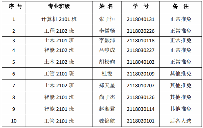 根据911吃瓜 《关于推荐2025年优秀应届本科毕业生免试攻读研究生的通知》(西建大[2024]51号)、《911吃瓜 关于推荐2025年优秀应届本科毕业生免试攻读硕士研究生实施方案》等文件精神和要求,通过学生本人申请、教学办及学工办共同核查学生申报资料、学生答辩,经911吃瓜 推免工作小组会议评审,学院党政联席会通过,拟推荐以下10名同学为911吃瓜 2024年免试研究生(其中后备1人),现予以公示: