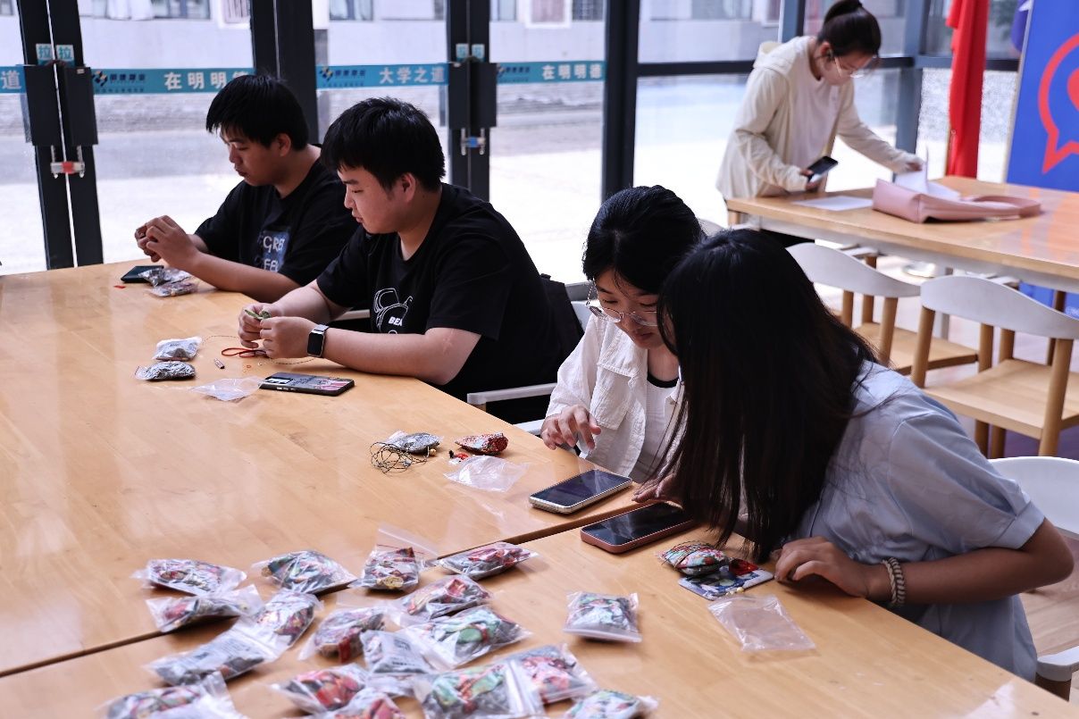活动现场,同学们在轻松愉快的氛围中围坐一堂,手持刺绣布片与艾草等材料,经过巧手制作,一件件造型别致、香气清雅的香囊逐渐成型。参与者们不仅体验了手工创作的乐趣,更在交流协作中舒缓了压力,收获了成就感。活动过程中,学生们纷纷用镜头记录下自己的作品与笑脸,现场洋溢着温馨与欢乐。