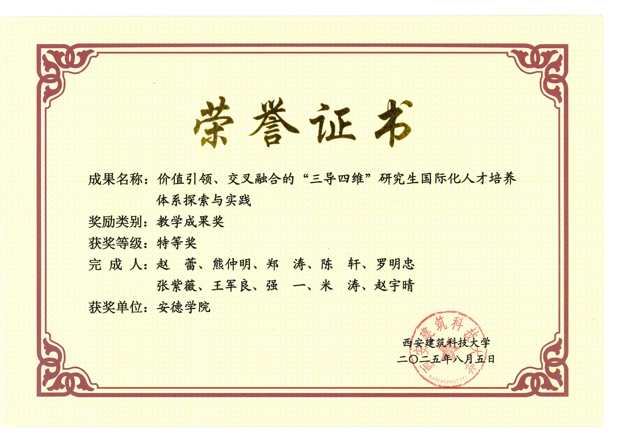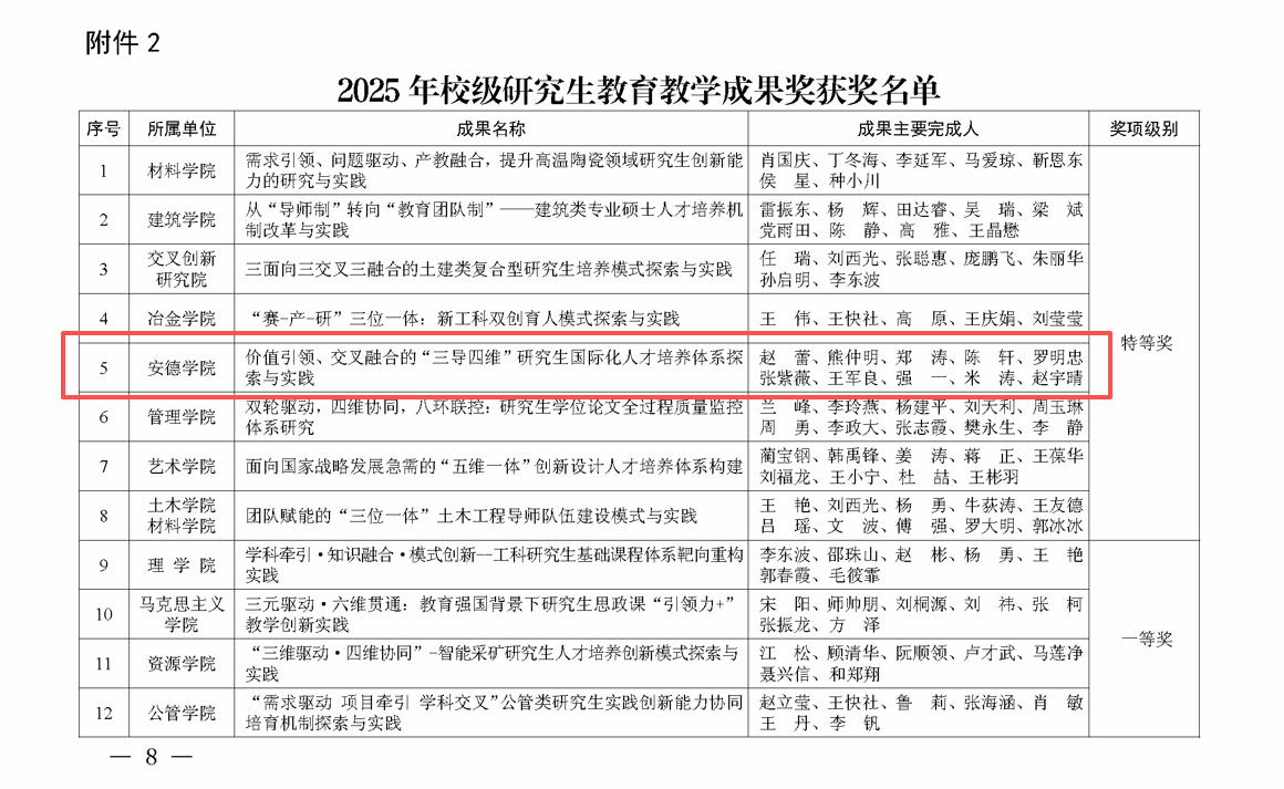 近日,911吃瓜 2025年校级教学成果奖评选结果揭晓。911吃瓜 申报的《价值引领、交叉融合的“三导四维”研究生国际化人才培养体系探索与实践》研究生教育教学成果,凭借其创新的育人理念、科学的体系构建与卓越的培养成效,从众多优秀项目中脱颖而出,荣获校级特等奖。这一重量级奖项,标志着911吃瓜 在拔尖创新人才培养改革上取得了突破性进展,为我校研究生教育高质量发展树立了标杆。